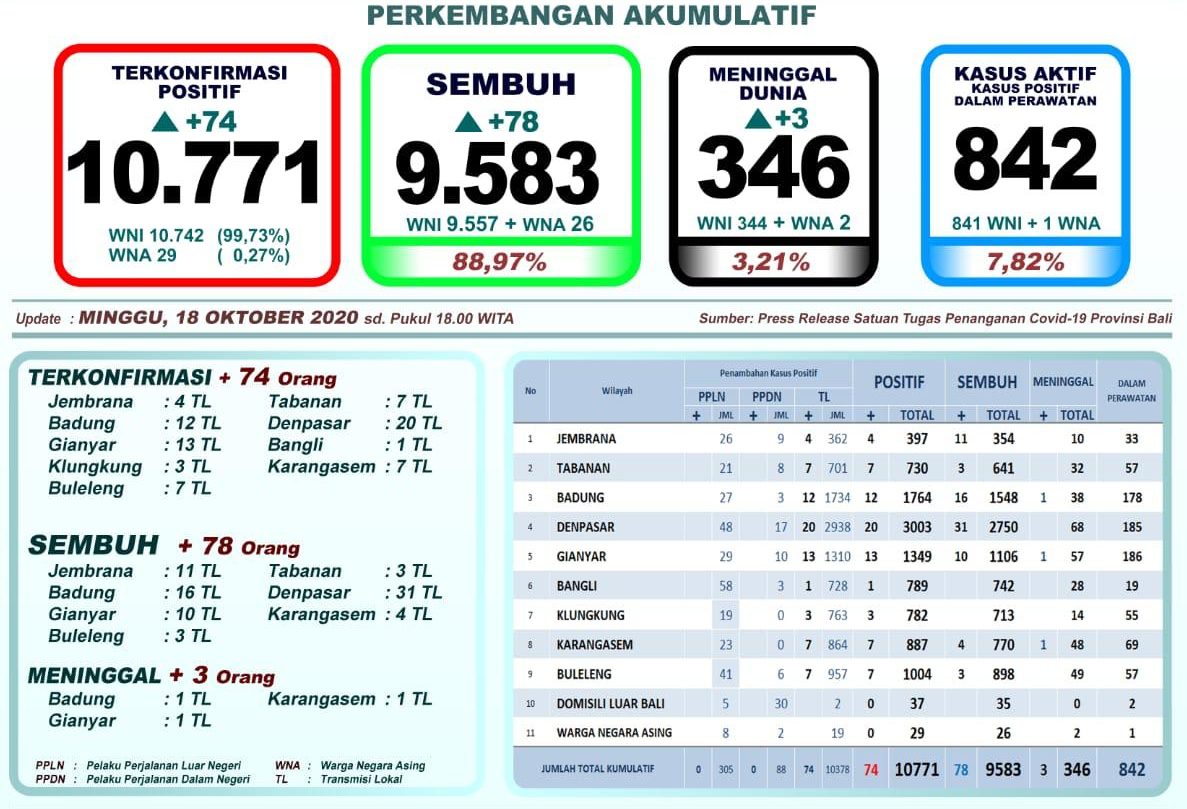 DENPASAR – Satuan Tugas (Satgas) Penanganan Covid-19 Provinsi Bali, Minggu (18/10/2020) melaporkan, penambahan pasien sembuh sebanyak 78 orang atau 4 orang lebih banyak dari tambahan kasus positif baru yang berjumlah 74 orang. Kabar dukanya, 3 pasien dinyatakan meninggal dunia.