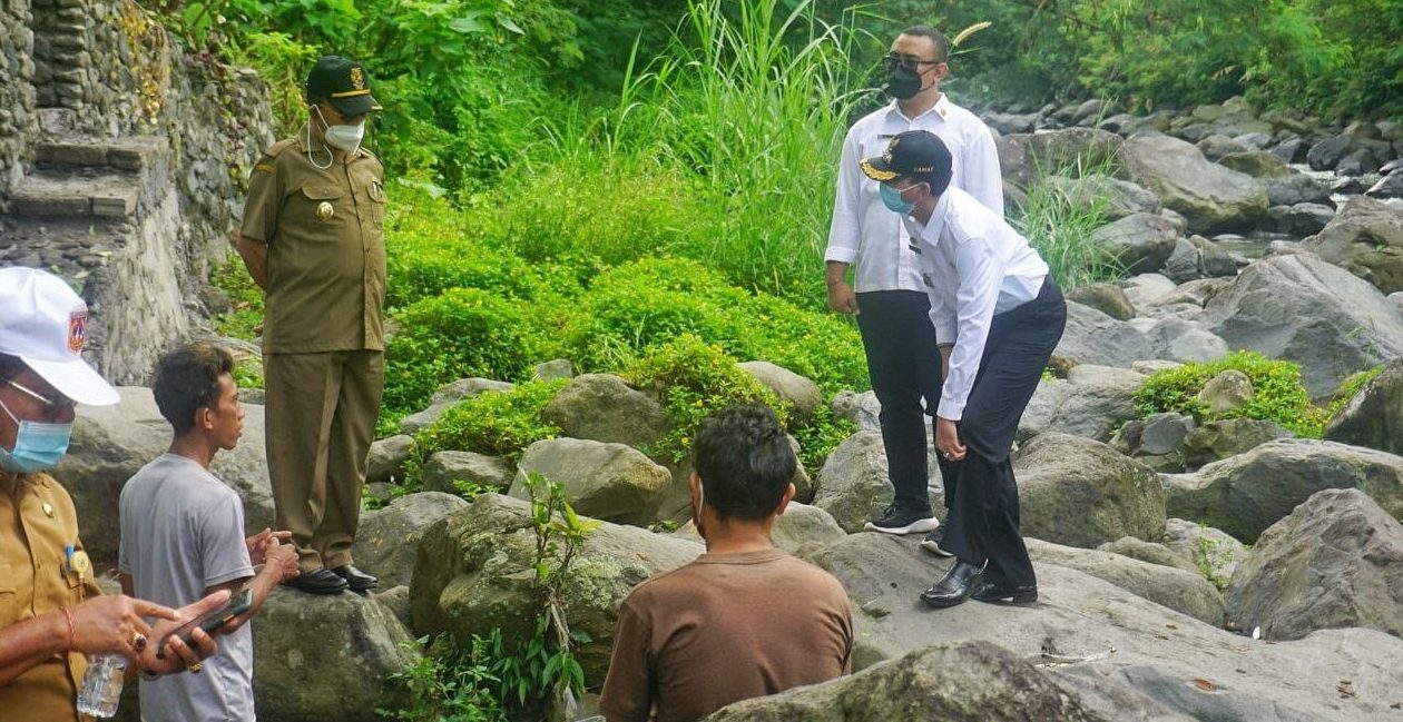 KARANGASEM – Menindaklanjuti laporan salah satu banjar adat di Kecamatan Sidemen terkait penyempitan alur Tukad (Sungai) Unda, Wakil Bupati (Wabup) Karangasem, I Wayan Artha Dipa; didampingi Asisten Ekonomi Pembangunan, I Made Suama; bersama Kepala Dinas PUPR Karangasem, I Nyoman Sutirtayasa, turun mengecek kondisi sebenarnya di Banjar Dinas Dukuh, Desa Sangkan Gunung, Sidemen, Rabu (28/4/2021).