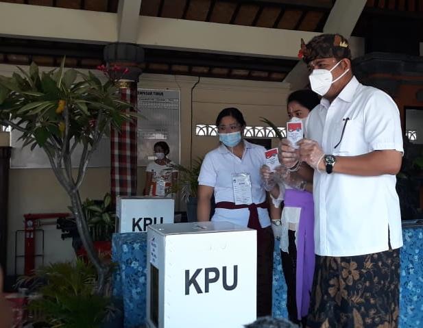 DENPASAR – Calon Wali Kota Denpasar nomor urut 2, I Gede Ngurah Ambara Putra, menggunakan hak pilihnya di TPS 11 Jalan Kenyeri No 15, Dusun Kerta Bumi, Sumerta Kaja, Denpasar, Rabu (9/12/2020). Ditemani istri, Desak Made Sari Saraswati Dewi, Ambara tiba di TPS dengan berjalan kaki dari rumah yang berjarak hanya puluhan meter sekitar pukul 9.15. Ngurah Ambara mendapat DPT 84 sementara sang istri DPT 85.