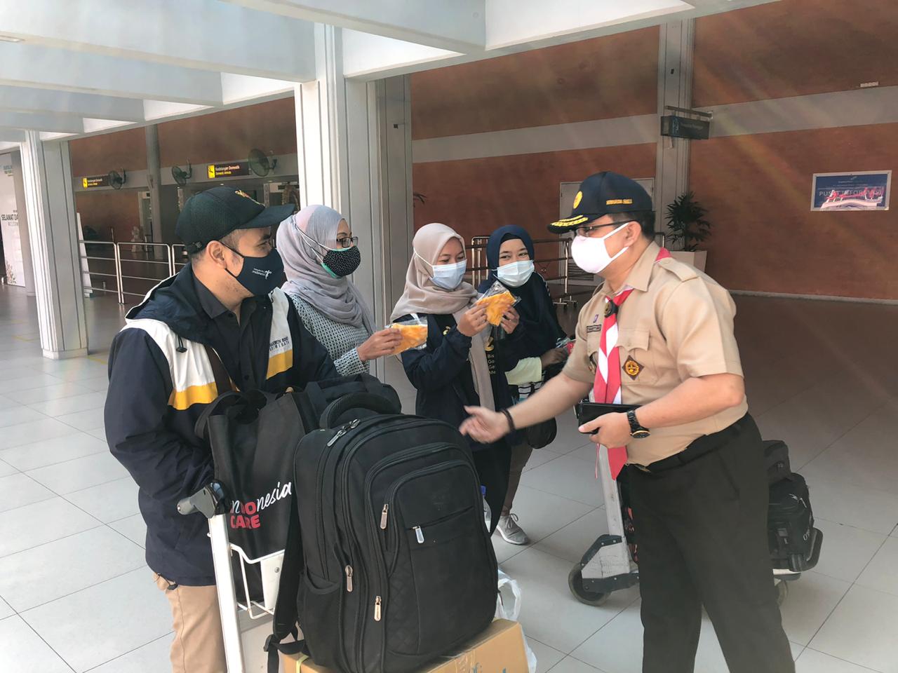 MANGUPURA – Manajemen PT Angkasa Pura I (Persero) bersama dengan Kwartir Daerah Gerakan Pramuka Bali (Kwarda Pramuka Bali) melaksanakan kegiatan sosialisasi perubahan perilaku adaptasi kebiasaan baru serta membagikan masker kepada para pengguna jasa di Bandar Udara Internasional I Gusti Ngurah Rai Bali, Kamis (3/12/2020).