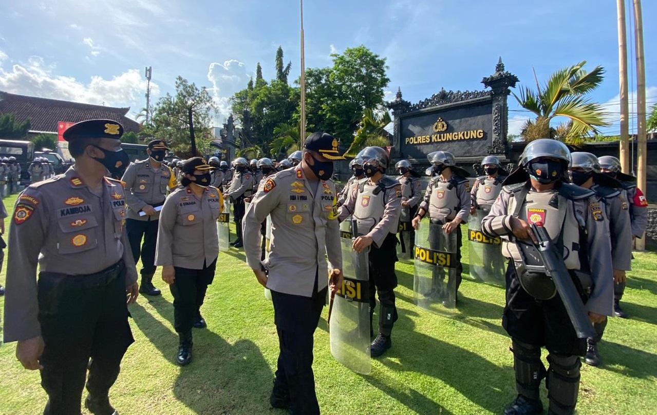 KLUNGKUNG – Mengantisipasi unjuk rasa susulan terkait penolakan UU Cipta Kerja, Polres Klungkung menggelar apel kendaraan dan peralatan di lapangan apel Polres Klungkung, Senin (12/10/2020). Apel kesiagaan dipimpin Kapolres AKBP Bima Aria Viyasa, dihadiri seluruh pejabat utama Polres dan personel dalam kompi Dalmas Polres Klungkung.