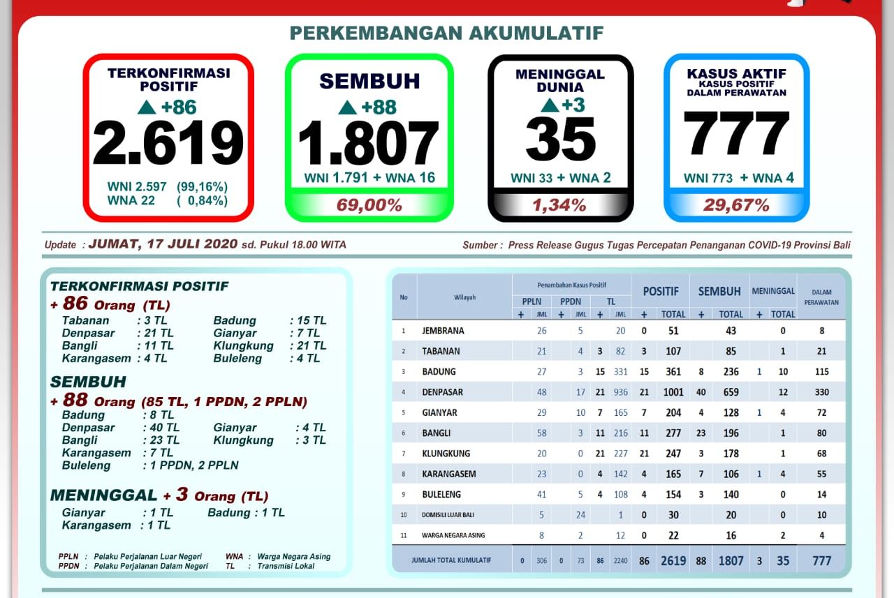 Kabar duka itu juga dibarengi dengan tambahan kasus baru positif sebanyak 86 orang WNI yang semuanya tertular akibat transmisi lokal. Hampir semua kabupaten/kota di Bali melaporkan tambahan positif, kecuali Jembana nihil.