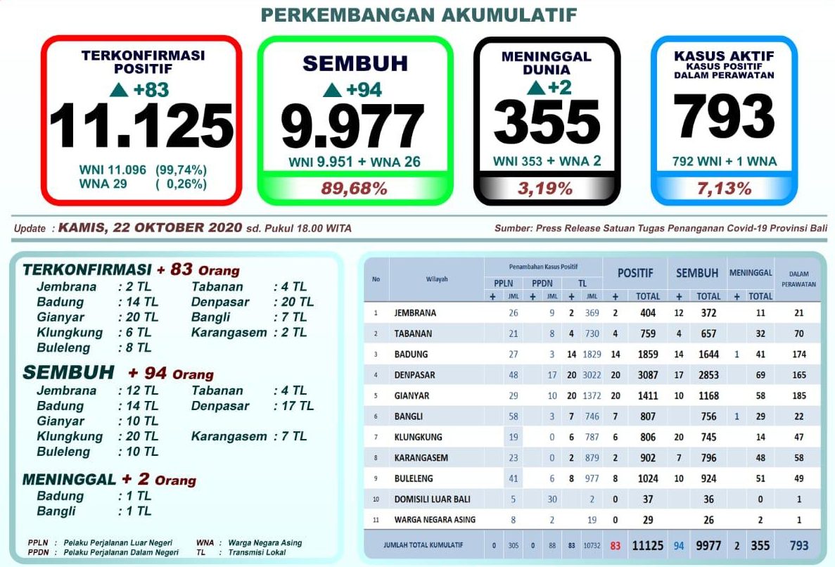 ”Secara kumulatif, sampai hari ini kasus positif covid-19 di Bali berjumlah 11.125 orang (11.096 WNI dan 29 WNA) yang didominasi transmisi lokal, dimana per hari ini jumlahnya mencapai 10.732 kasus,” jelas Rentin.