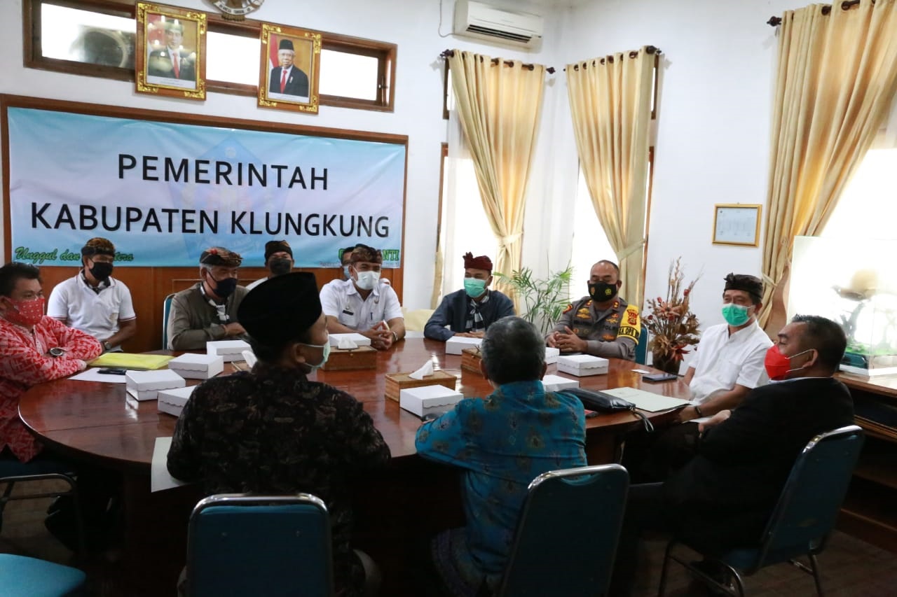 KLUNGKUNG – Menindaklanjuti kasus dugaan penistaan Agama Hindu yang dilakukan oleh anggota DPD RI, Arya Wedakarna (AWK), tim Badan Kehormatan (BK) DPD RI sebanyak lima orang bertemu para tokoh Nusa Penida dan Bupati Klungkung, Nyoman Suwirta, Rabu (10/2/2021) di kantor Bupati Klungkung. Sebelum pertemuan dengan BK DPD RI dimulai, Bupati Suwirta berkoordinasi dengan AA Ngurah Mayun yang merupakan pengacara Komponen Rakyat Bali (KRB).