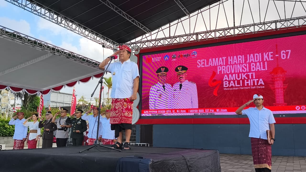 POSMERDEKA.COM, BANGLI – Upacara peringatan hari jadi ke-67 Provinsi Bali dan Hari Pramuka ke-64 di Kabupaten Bangli berlangsung khidmat di Alun-alun Bangli, Kamis (14/8/2025). Ratusan peserta upacara terdiri dari para aparatur sipil negara (ASN), pimpinan perangkat daerah, Forkopimda serta TNI/Polri. Bupati Bangli, Sang Nyoman Sedana Arta, bertindak sebagai Inspektur Upacara.