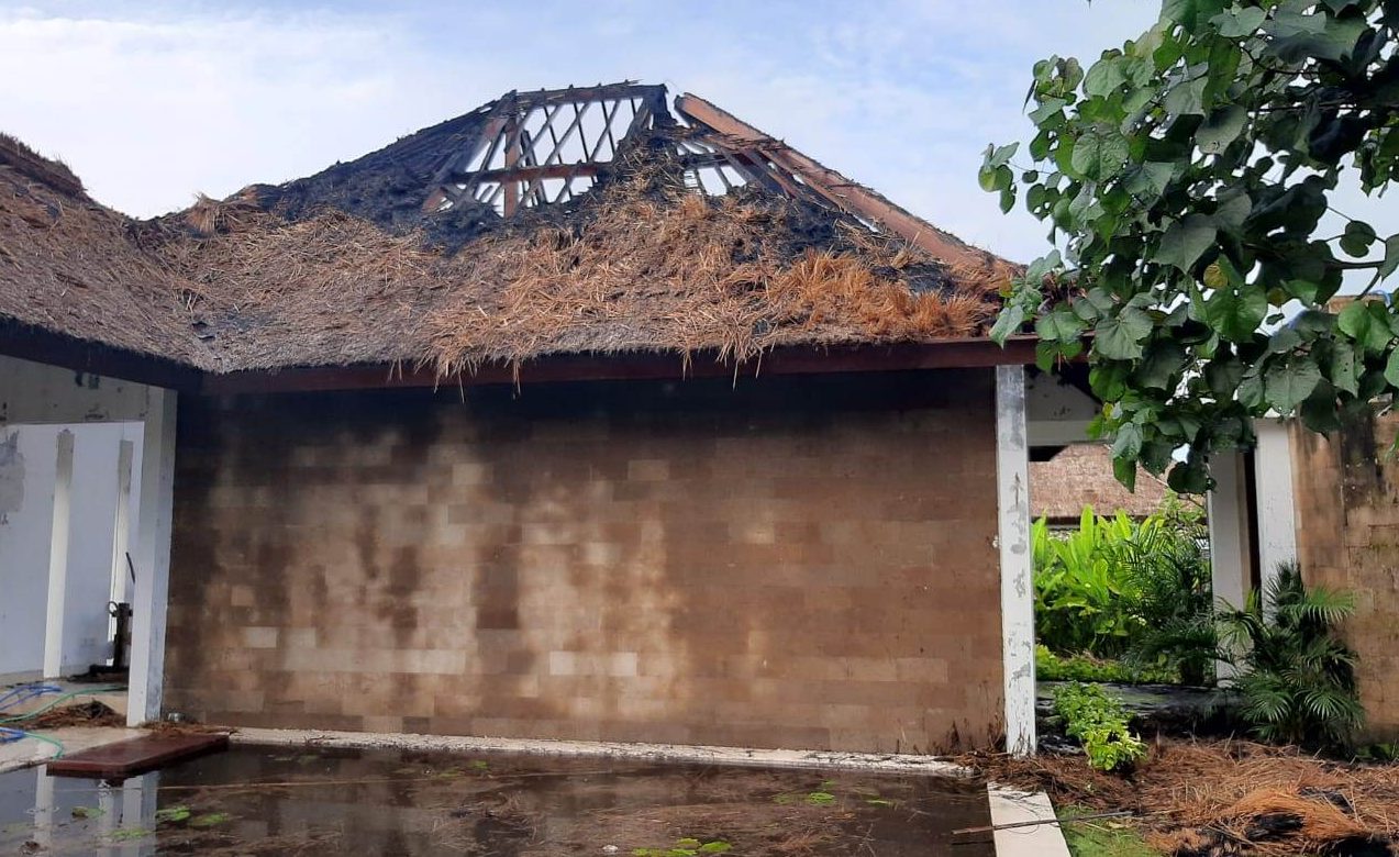 TABANAN – Bagian atap lobi Vila Beraban Beach House (Bonti) di Banjar Tegalmengkeb Kelod, Desa Tegalmengkeb, Kecamatan Selemadeg Timur (Seltim), Tabanan, Bali hangus terbakar, Jumat (5/2/2021). Penyebab kebakaran diduga karena bagian atap tersebut disambar petir.