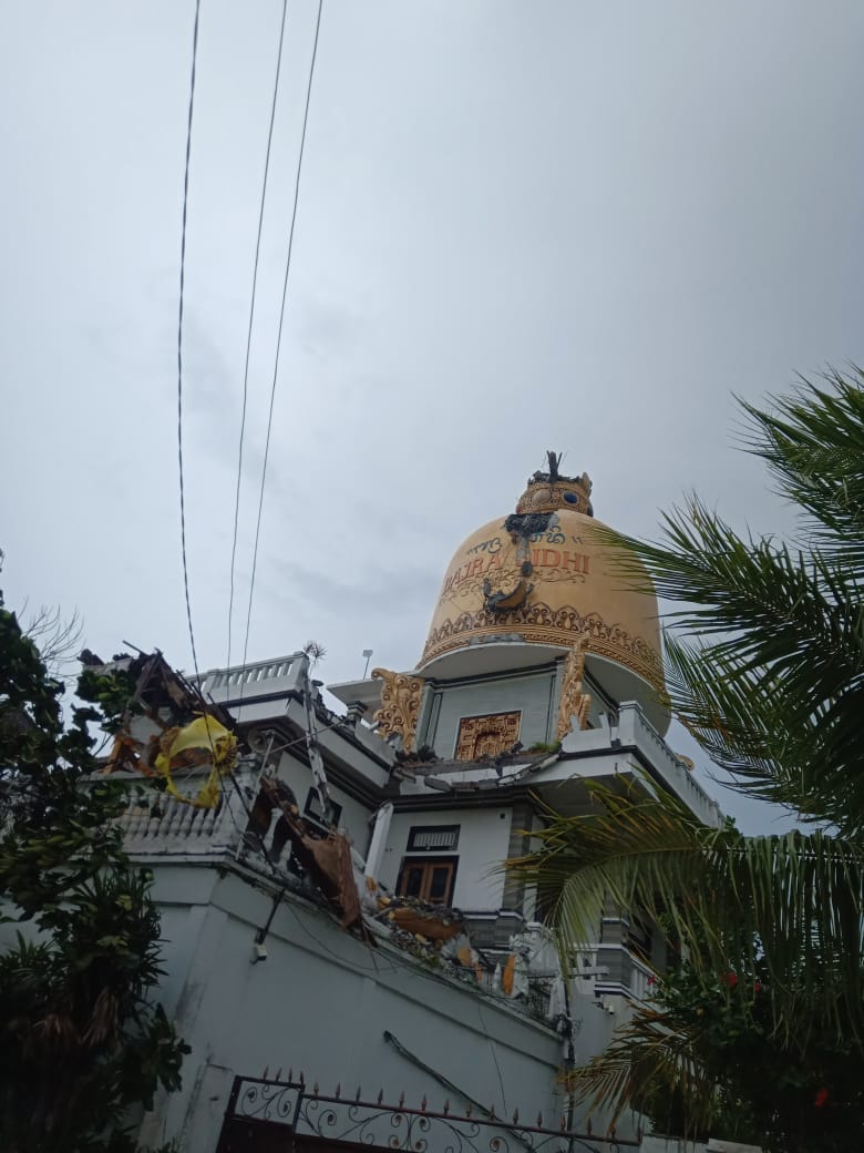 MANGUPURA – Sebuah bangunan yang menjadi ikon di Desa Munggu, Kecamatan Mengwi, roboh diterjang angin kencang, Rabu (9/12/2020) sekitar pukul 14.00. Bangunan genta bertulis Bajra Sidhi tersebut patah pada bagian atasnya atau pada gagang. Beruntung tidak ada korban jiwa atau runtuhnya bangunan di kediaman Jro Mangku Dalem Sangkenan itu.