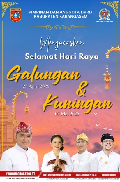 POSMERDEKA.COM, KARANGASEM – Ketua DPRD Karangasem, I Wayan Suastika, mengucapkan selamat Hari Raya Galungan dan Kuningan bagi umat Hindu di seluruh Nusantara. Hari Raya Galungan tahun ini tiba pada 23 April, dan Hari Raya Kuningan jatuh pada 3 Mei atau 10 hari setelah Galungan.