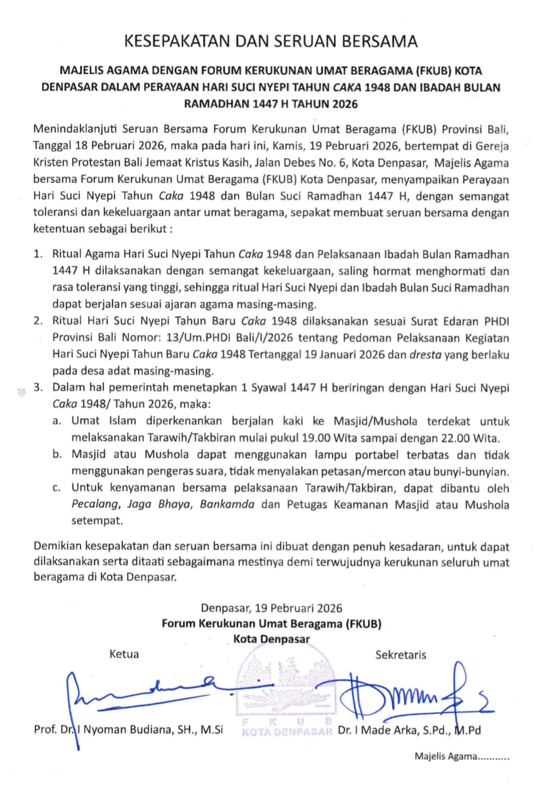 Seruan Bersama disepakati pada Kamis (19/2/2026), bertempat di Gereja Kristen Protestan Bali Jemaat Kristus Kasih, Jalan Debes No. 6, Kota Denpasar. Seruan bersama tersebut ditandatangani Ketua FKUB Kota Denpasar, I Nyoman Budiana dan Sekretaris FKUB Kota Denpasar, I Made Arka.