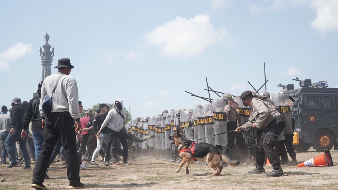 POSMERDEKA.COM, DENPASAR – Sebagai persiapan menghadapi segala bentuk eskalasi gangguan dan mengamankan pelaksanaan Pemilu 2024, Polda Bali menggelar latihan Sistem Pengamanan Kota (Sispamkota) di Lapangan Niti Mandala Renon, Denpasar, Senin (2/10/2023). Untuk menguji kesiapan personel dalam situasi tertentu, dalam latihan yang dihadiri Kapolda Bali, Irjen Ida Bagus Kade Putra Narendra dan Forkopimda Provinsi Bali ini, dilakukan simulasi dengan skenario tertentu.