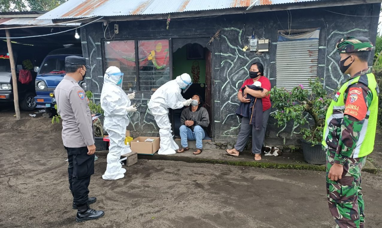 BANGLI – Gugus Tugas Penanganan Covid-19 Kecamatan Kintamani melaksanakan pelacakan kontak pasien positif Covid-19 di Desa Batur Utara, Jumat (19/2/2021). Penelusuran dibantu Kodim 1626/Bangli ini dilakukan karena ada salah satu warga diketahui terpapar Corona Covid-19 usai melakukan tes cepat antigen.