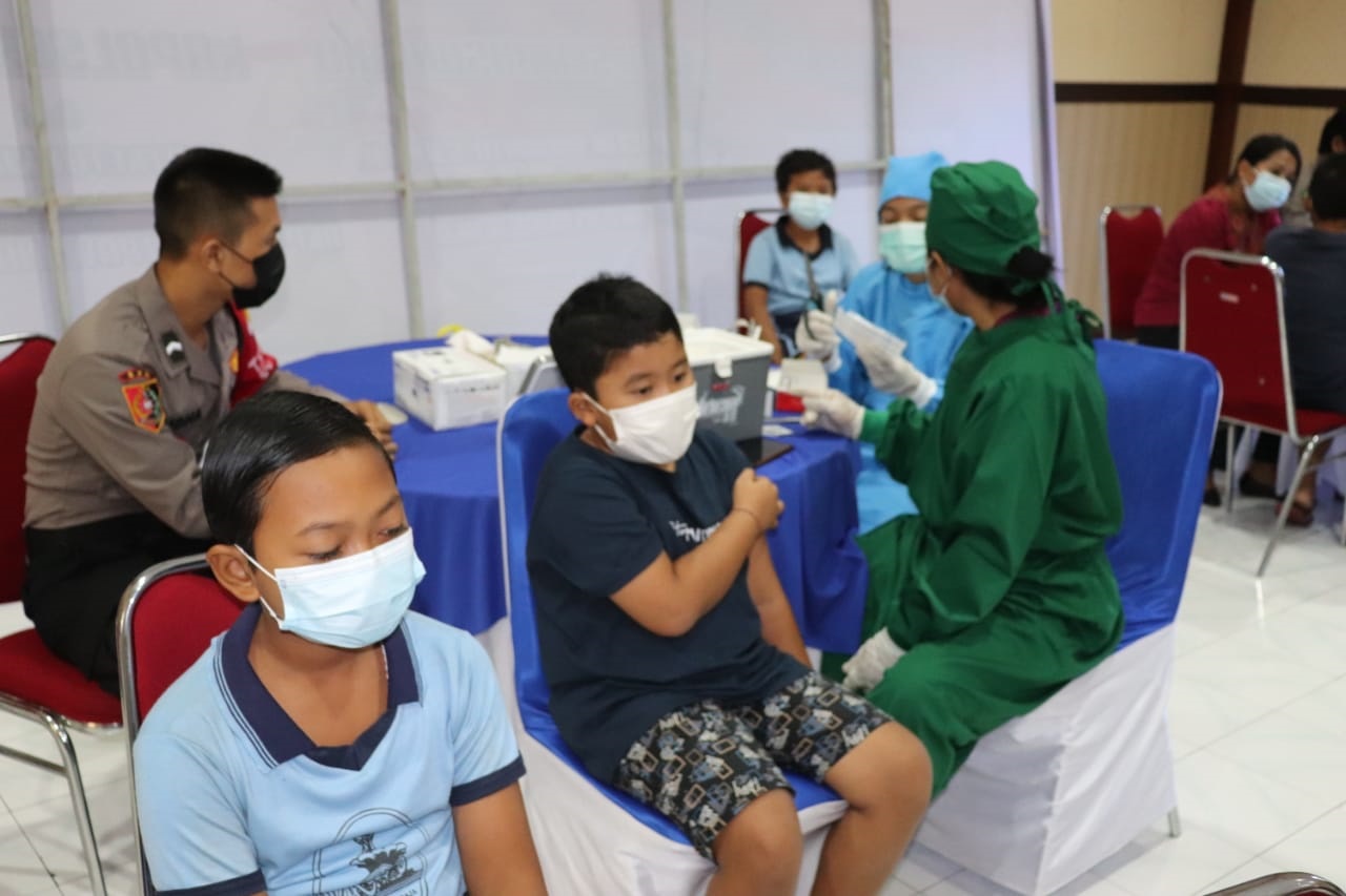 BULELENG – Gerai Vaksin Presisi Bakti Kesehatan menyasar anak-anak usia 6 tahun sampai 11 tahun, Kamis (16/12/2021) di beberapa tempat menyedot perhatian masyarakat. Terbukti, ratusan anak-anak datang untuk mendapat vaksin Covid-19 yang dilaksanakan langsung oleh Polres Buleleng.