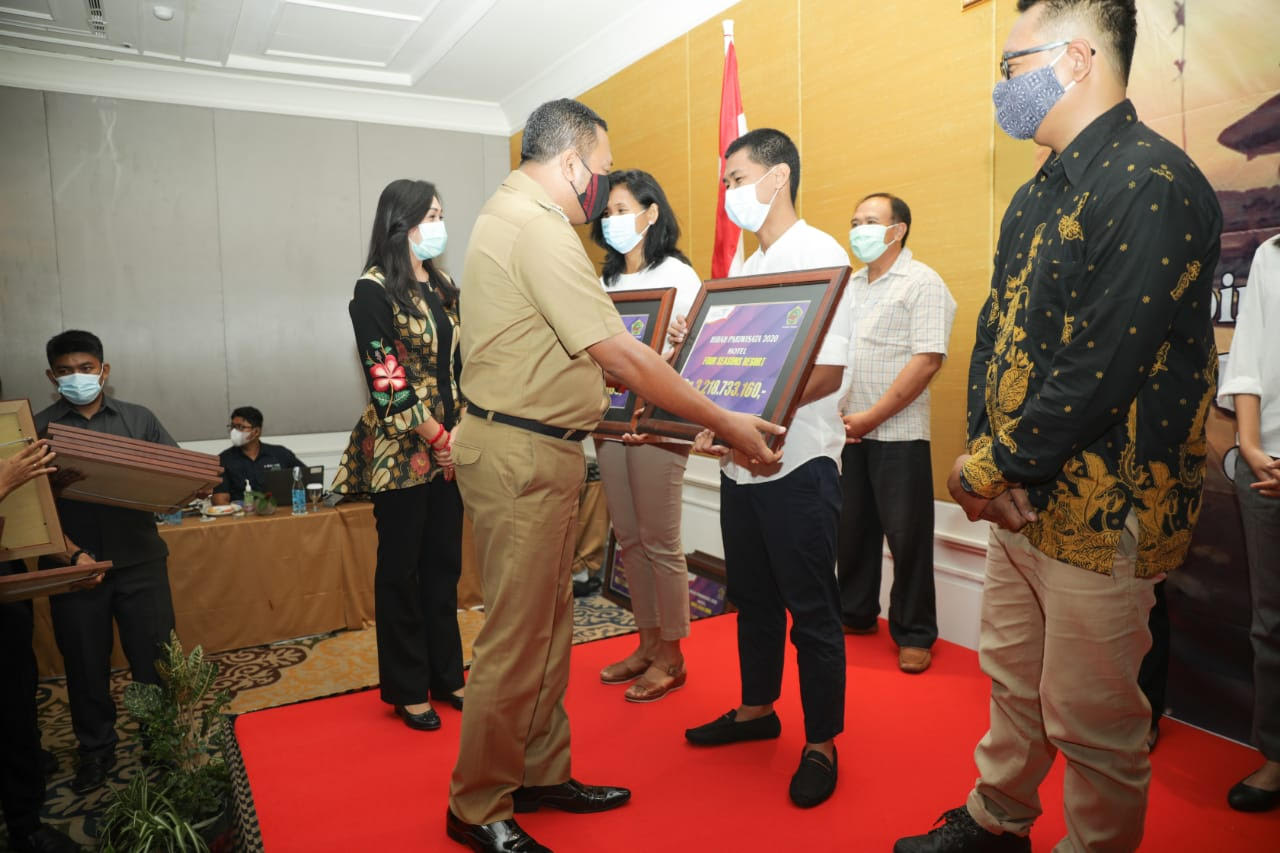GIANYAR – Gianyar menjadi kabupaten pertama di Indonesia yang mencairkan hibah pariwisata kepada 160 wajib pajak hotel dan restoran di Gianyar, Senin (16/11/2020) di Desa Lebih. Bupati Gianyar, I Made Mahayastra, dalam penyerahan bantuan itu juga membuka acara bimbingan teknis program Cleanliness, Health, Safety, Environment (CHSE) bagi pelaku usaha hotel dan restoran dengan menghadirkan narasumber dari Kementerian Pariwisata dan Ekonomi Kreatif, Anak Agung Gde Putra.