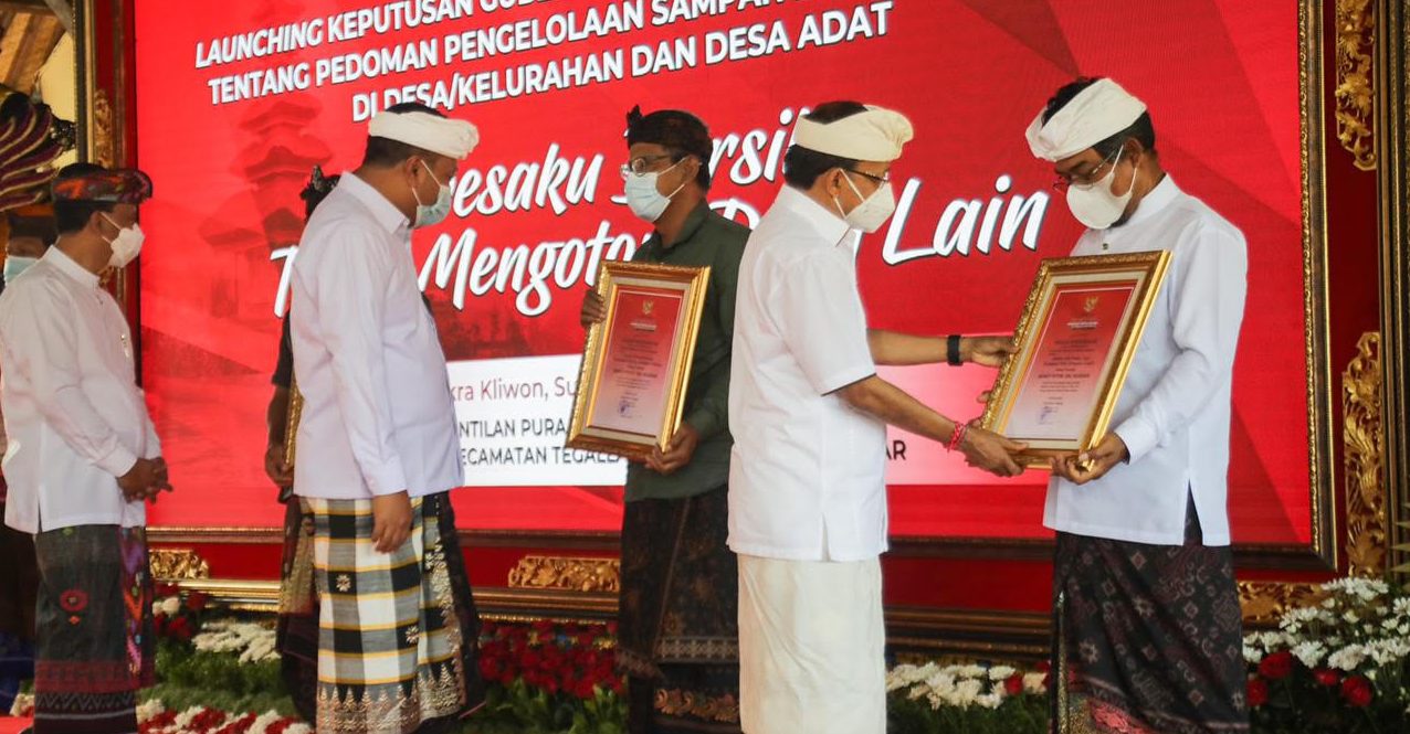 GIANYAR – Gubernur Bali, Wayan Koster, memberi penghargaan kepada lima desa di Bali yang komitmen mengelola sampah berbasis sumber. Desa itu yakni Desa Taro, Tegallalang; Desa Adat Padangtegal, Ubud; Desa Punggul, Kecamatan Abiansemal, Badung; Desa Baktiseraga, Buleleng; dan Desa Paksebali Dawan, Klungkung.