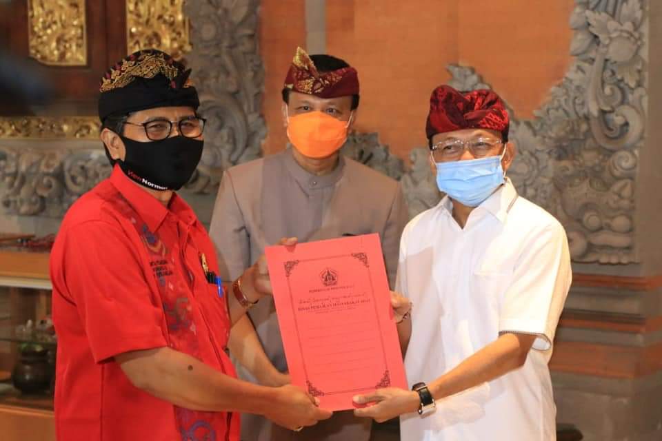 Bertepatan dengan dimulainya pemberlakuan Protokol Tatanan Kehidupan Era Baru, Kamis (9/7/2020), Gubernur Koster didampingi Sekretaris Daerah (Sekda) Provinsi Bali Dewa Made Indra, Ketua MDA Provinsi Bali Ida Penglisir Agung Putra Sukahet menyerahkan secara simbolis pararem tentang Pengaturan Pencegahan dan Pengendalian Gering Agung Covid-19 di Desa Adat se-Bali yang diwakili oleh Ketua Madya MDA Kabupaten/Kota sejebag Bali, di Gedung Gajah, Jaya Sabha, Denpasar.
