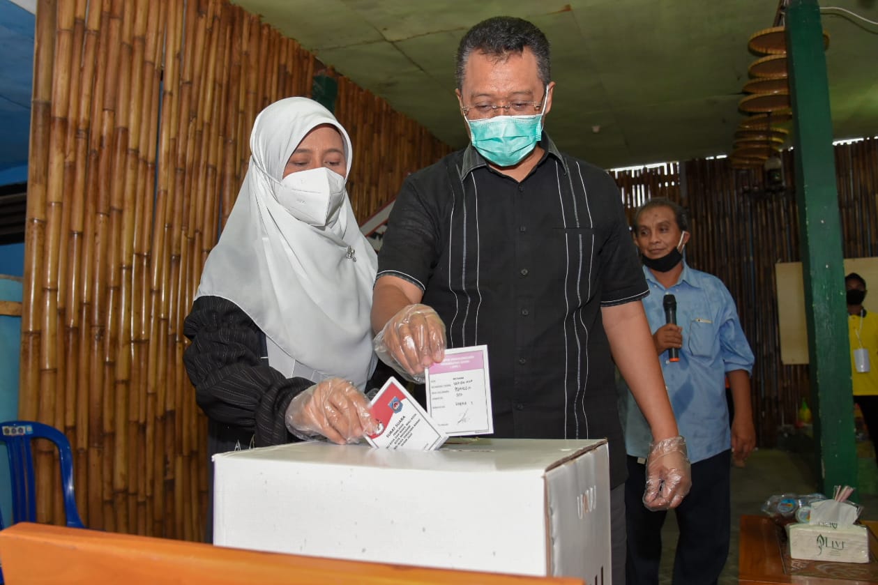 MATARAM – Gubernur NTB, Zulkieflimansyah, menggunakan hak pilihnya di TPS 02 Lingkungan Pusaka, Kelurahan Pejanggik, Kota Mataram, Rabu (9/12/2020). Ditemani istri, Niken Saptarini Widyawati Zulkieflimansyah, Bang Zul, sapaan akrabnya, datang ke TPS mengenakan baju hitam lengan pendek.