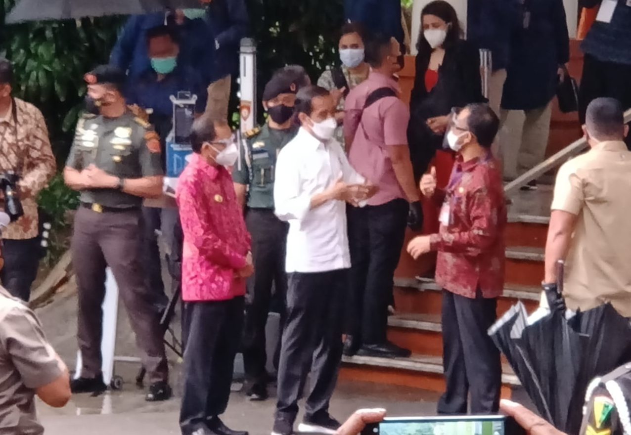 Presiden Jokowi didampingi Menteri Pariwisata dan Ekonomi Kreatif RI, Sandiaga Salahudin Uno, Menteri Kesehatan RI, Budi Gunadi Sadikin, Kordinator Staf Khusus Presiden RI, Ari Dwipayana, Wakil Menteri Pariwisata dan Ekraf RI, Angela Tanoesudibyo, Gubernur Bali, Wayan Koster serta Wakil Walikota Denpasar, I Kadek Agus Arya Wibawa.