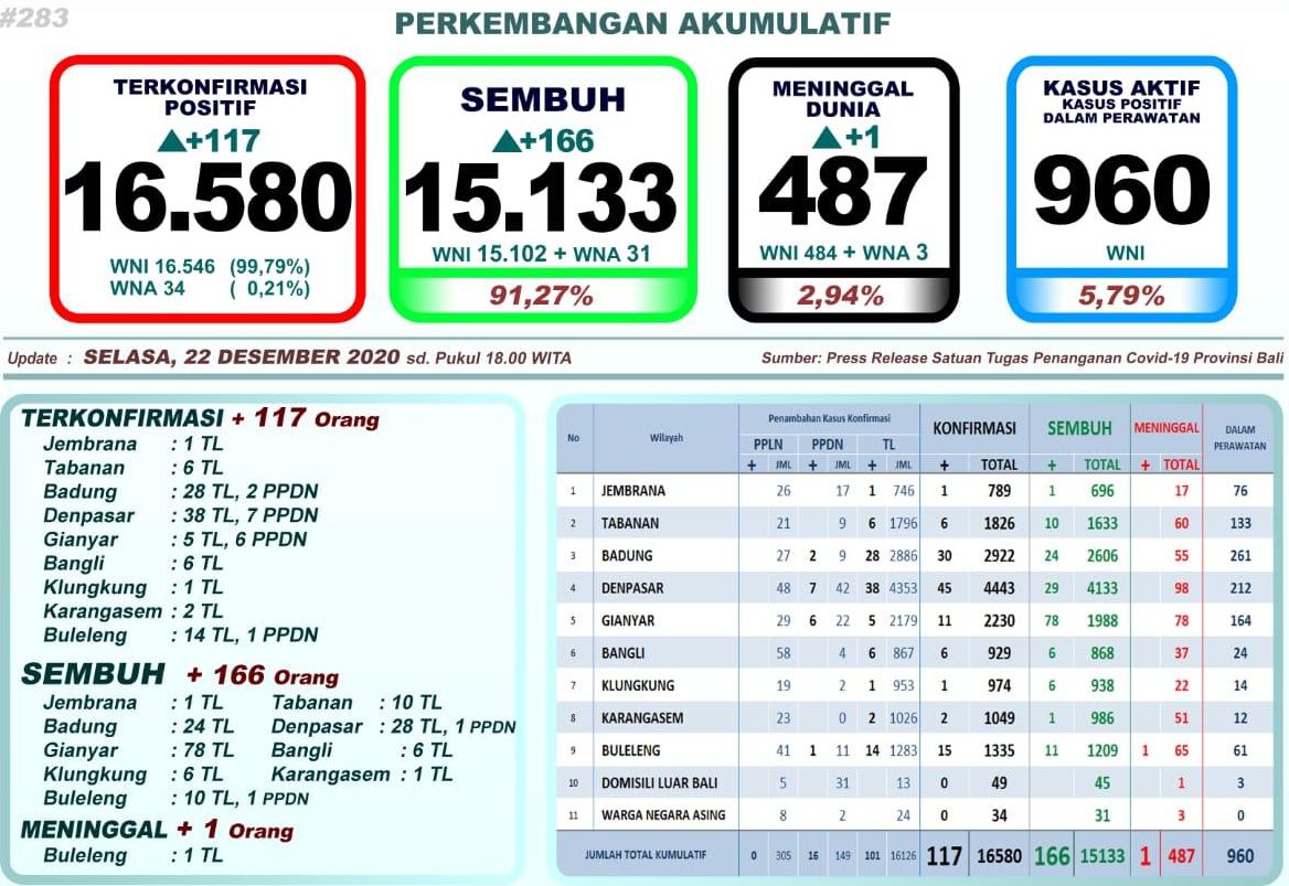 DENPASAR – Perkembangan harian pandemi Covid-19 di Bali, Selasa (22/12/2020) mencatat lonjakan pasien sembuh sebanyak 166 orang. Atau 49 lebih banyak dari tambahan kasus terkonfirmasi positif yang berjumlah 117 orang (101 transmisi lokal dan 16 PPDN).