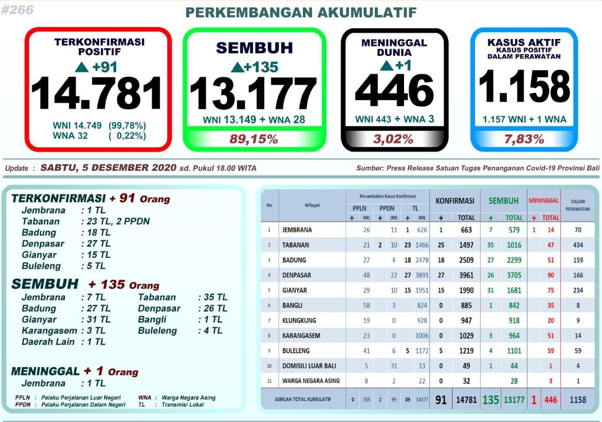 ”Jadi, total pasien sembuh di Bali kini berjumlah 13.177 orang (89,15%) dengan rincian 13.149 WNI dan 28 WNA,” ujar Sekretaris Satgas Penanganan Covid-19 Provinsi Bali, Drs. I Made Rentin, AP.M.Si, Sabtu (5/12/2020).