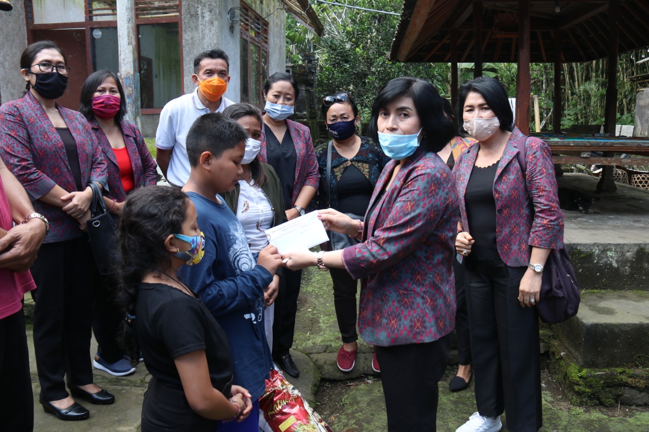 Dalam kesempatan itu, Widiasmini Indra menyerahkan bantuan berupa uang tunai dan paket sembako kepada keluarga tersebut. Meski jumlahnya tak banyak, ia berharap bantuan dari DWP itu dapat meringankan beban mereka. “Tetap semangat dan rajin sekolah ya,” ujarnya sembari menepuk pundak Putu Arsa dan adiknya.