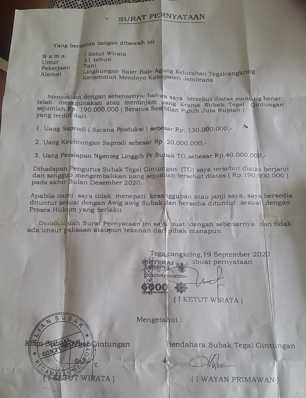 Sementara itu, Kelian Subak Tegalgintungan, I Ketut Wirata, saat dikonfirmasi mengakui dirinya menggunakan uang sebesar Rp190 juta tersebut. Namun uang tersebut masih digunakan oleh krama sekitar Rp180 juta.
