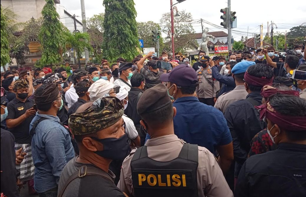 “Saya tidak melarang saudara untuk memberi dukungan terhadap kami selaku pengurus dalam perkara ini. Namun, kami mohon pengertiannya, karena masih dalam situasi PPKM Level 4, kami yang saudara percayai minta saudara sekalian untuk membubarkan diri, pulang ke Guwang. Jika situasi normal silakan beramai di sini kawal tanah leluhur kita,” lugasnya menggunakan pengeras suara dalam Bahasa Bali, dan disambut sorak-sorai warga.