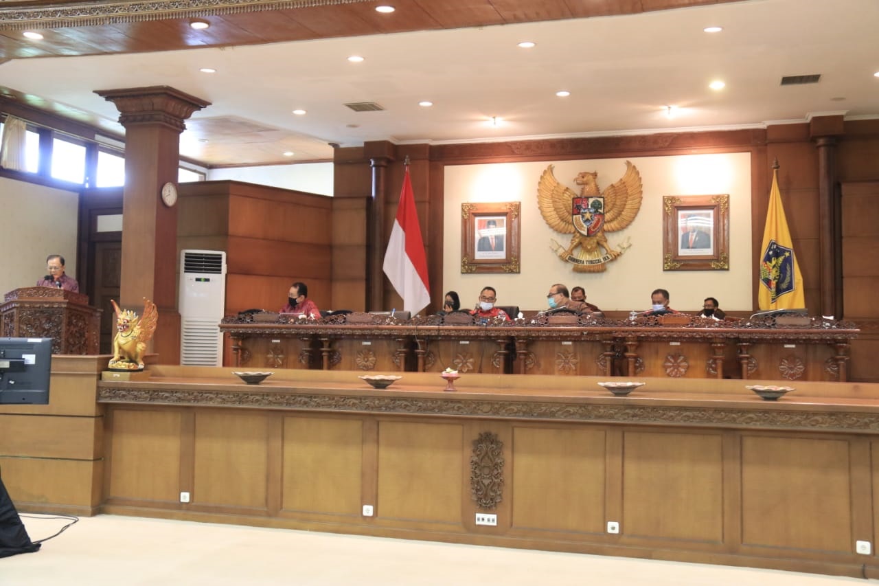 DENPASAR – Gubernur Bali, Wayan Koster; dan Wakil Gubernur Bali, Tjokorda Oka Artha Ardhana Sukawati, menghadiri Rapat Paripurna DPRD Bali dengan agenda Laporan dan sikap/keputusan dewan terhadap pembahasan Raperda Perubahan Kedua atas Perda Nomor 10 Tahun 2016 tentang Pembentukan dan Susunan Perangkat Daerah dan Penyampaian Penjelasan Kepala Daerah terhadap Raperda APBD Semesta Berencana Provinsi Bali Tahun 2021 bertempat di Ruang Sidang Utama DPRD Provinsi Bali, Senin (9/11/2020).