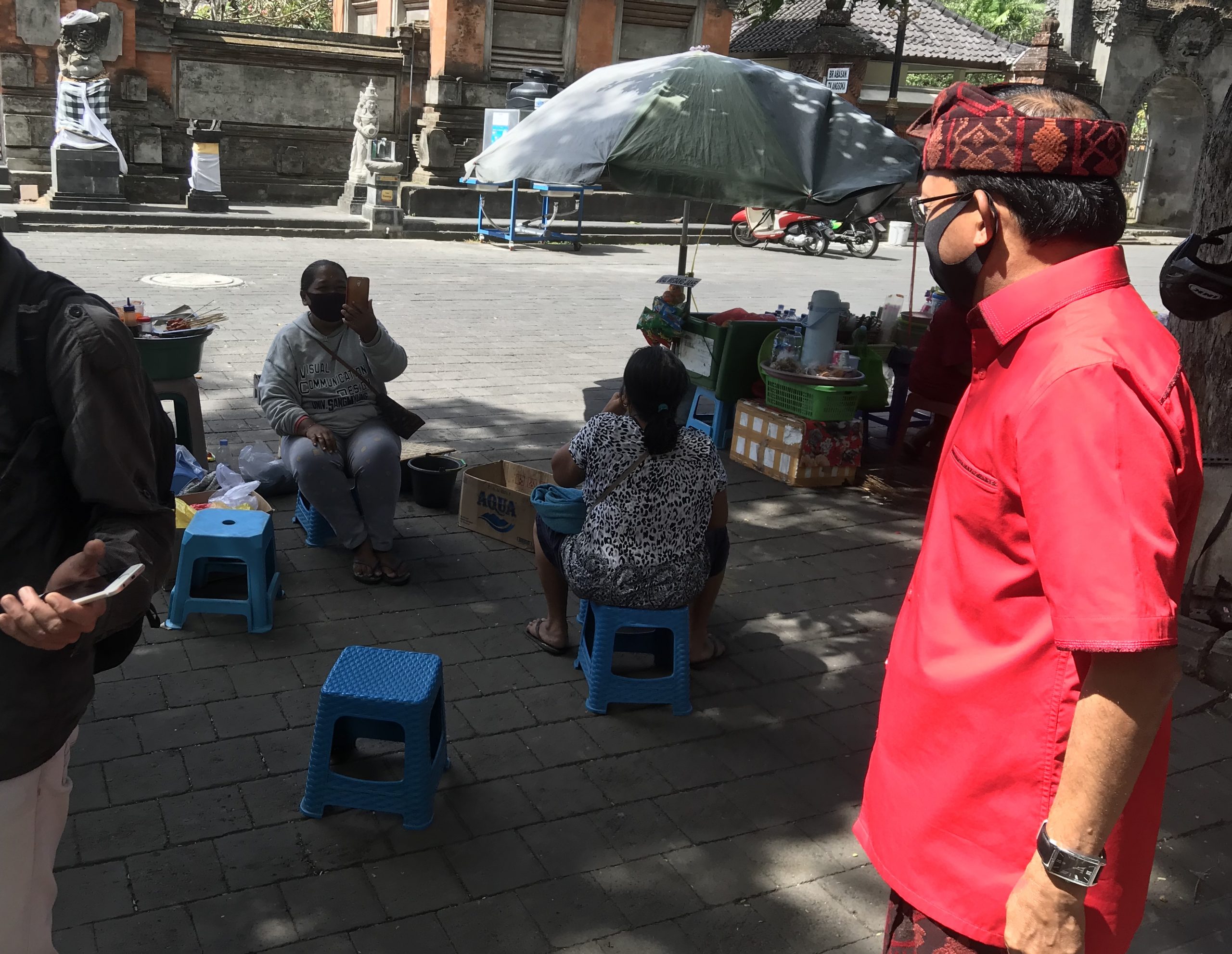 Di sela-sela wawancara sambil berjalan itu, Koster sempat menyapa para pedagang asongan yang berjualan di sisi timur lapangan Puputan Badung, di depan Pura Jagatnata. Sejumlah ibu-ibu pedagang yang melihat Koster berjalan di trotoar, spontan melambaikan tangan seraya memanggil namanya. “Pak Gubernur, mriki (ke sini),” sapa seorang pedagang minuman ringan yang duduk di bangku kecil melambai. Ekspresinya terlihat semringah.