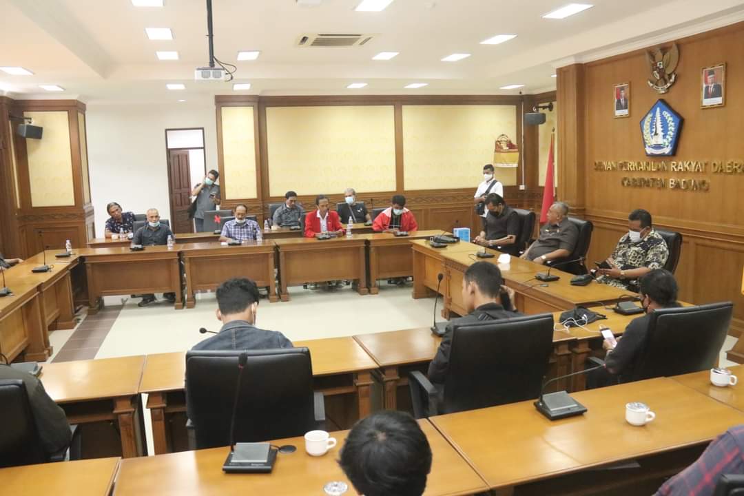 MANGUPURA – Perwakilan petani Subak Balangan dan Subak Uma Tegal, Desa Kuwum, Kecamatan Mengwi, Kabupaten Badung mendatangi kantor DPRD Badung, Senin (22/2/2021). Petani yang didampingi puluhan Gerakan Mahasiswa Nasional Indonesia (GMNI) Marhaen tersebut menyampaikan aspirasinya ke wakil rakyat, sudah 20 tahun tidak pernah mendapat air dari hulu (Tabanan) untuk mengaliri sawahnya. Akibatnya, sejumlah sawah petani mengalami kekeringan. Kedatangannya diterima Ketua DPRD Badung, I Putu Parwata.