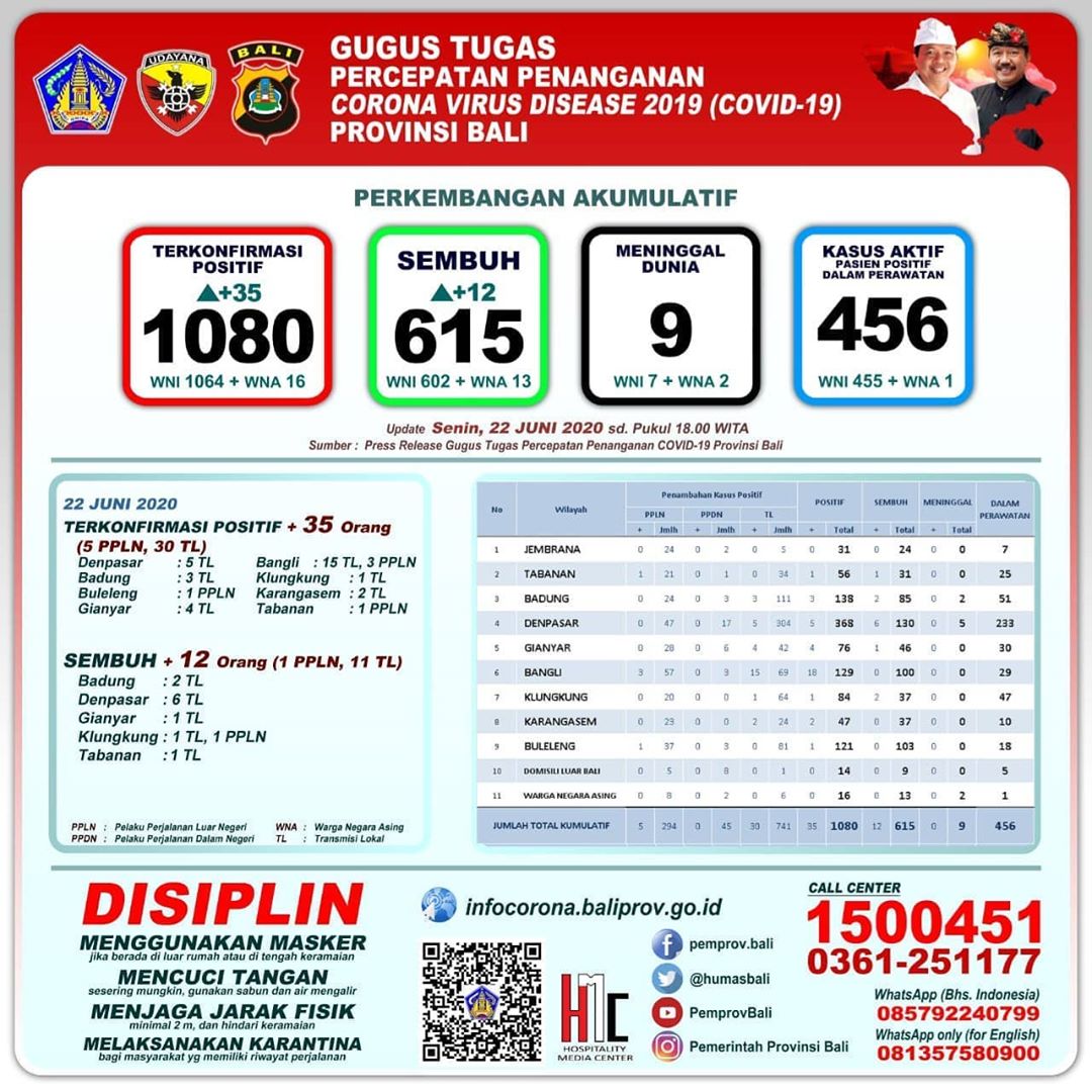 DENPASAR – Perkembangan harian kasus positif Covid-19 di Bali terus meningkat menjadi 1.080 orang, setelah ada tambahan 35 orang, Senin (22/6/2020) yang didominasi penularan transmisi lokal (TL).