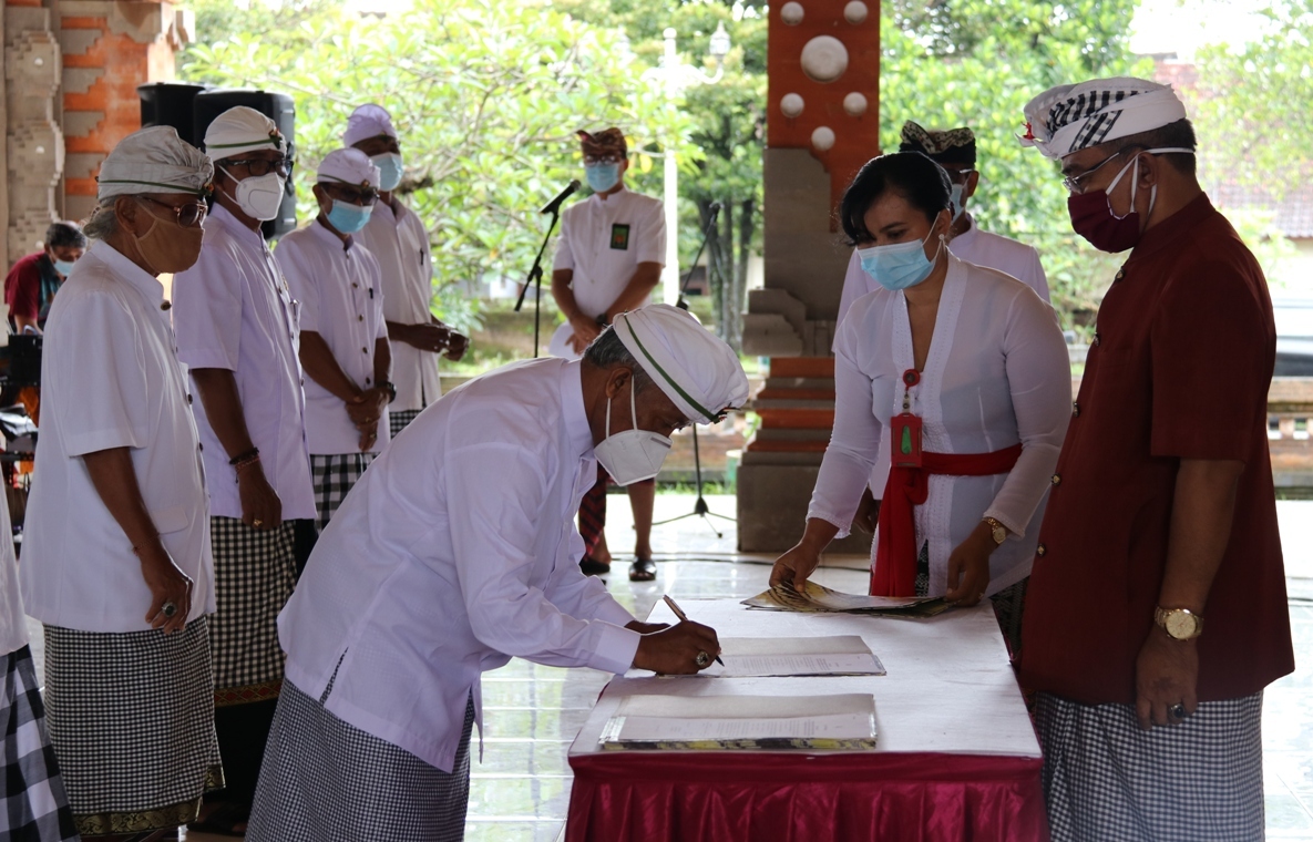 TABANAN – Sekda Tabanan I Gede Susila menghadiri pengukuhan dan pejaya-jayaan prajuru Majelis Desa Adat (MDA) kecamatan se-Kabupaten Tabanan masa bakti 2021-2026, di Gedung Kesenian I Ketut Maria Tabanan, Bali, Jumat (8/1/2021).