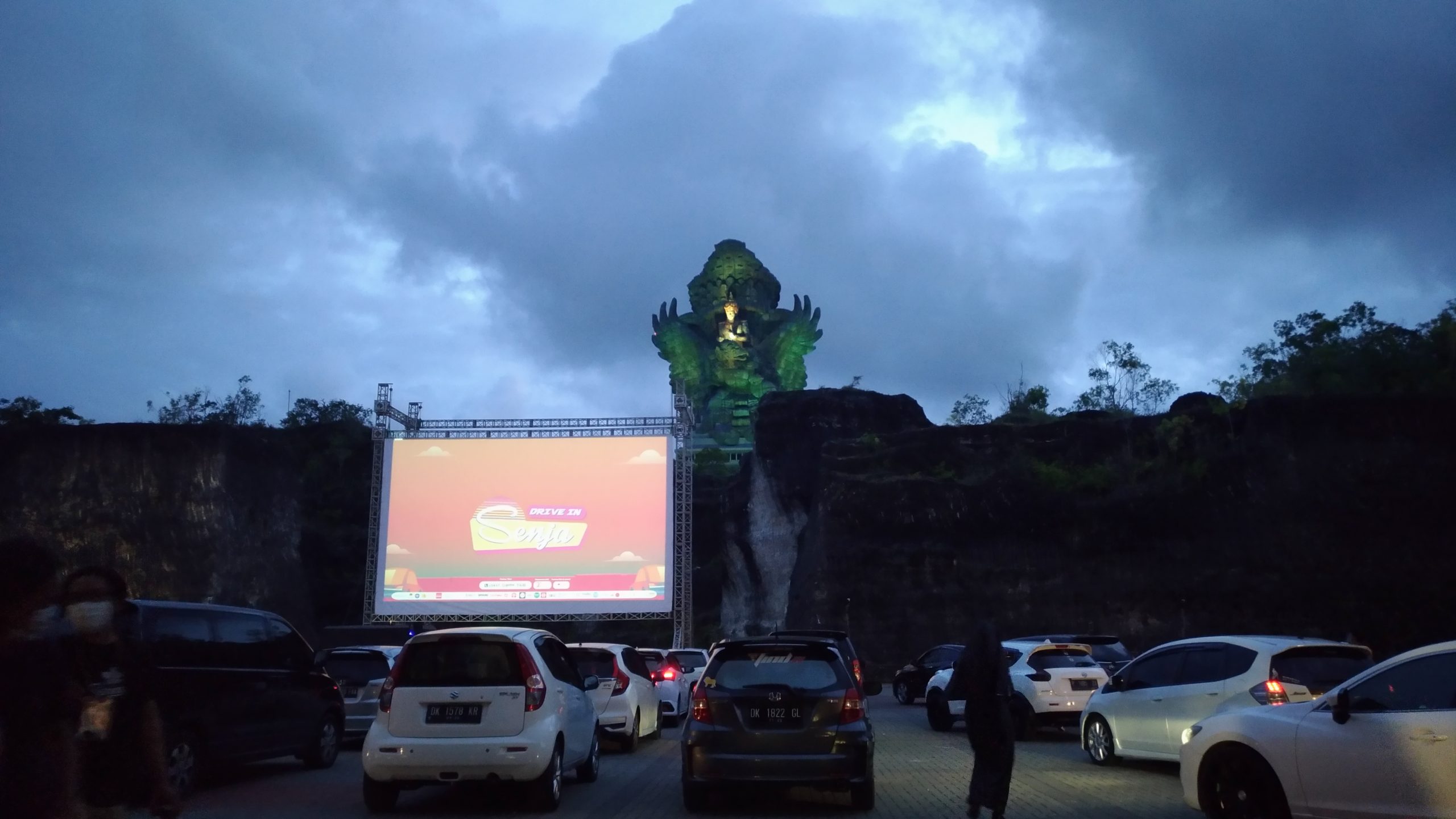 MANGUPURA – Ratusan mobil roda empat, Selasa (22/12/2020) malam berjejer di kawasan festival park area Garuda Wisnu Kencana (GWK) Cultural Park. Dimana penumpang yang ada di dalam mobil disajikan dengan film layar tancap pada layar lebar yang disediakan, dengan audio yang terkoneksi langsung ke dalam mobil. Hal itu membuat penumpang seolah merasakan suasana bioskop dalam mobil dengan latar patung Garuda Wisnu. Kegiatan tersebut bertajuk Drive In Senja Bali, yaitu official drive-in theater pertama di Indonesia.