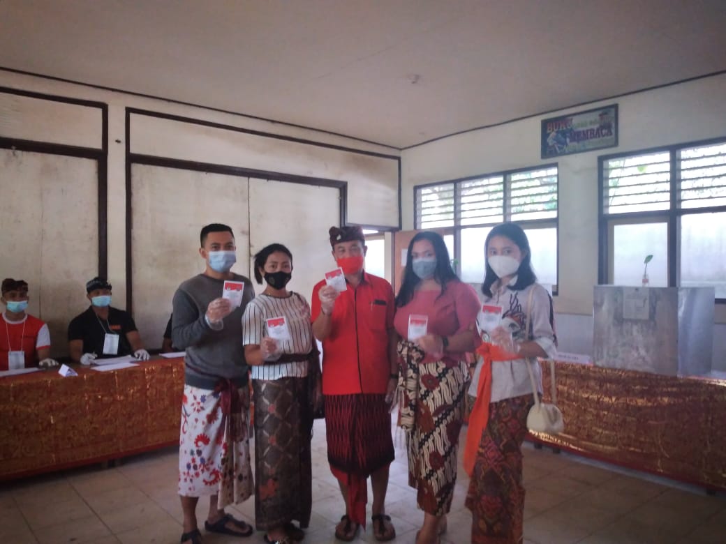 KARANGASEM – Kandidat Bupati Karangasem nomor urut 1, I Gede Dana, menyalurkan hak pilihnya di TPS 20, Banjar Lebah, Desa Datah, Kecamatan Abang, didampingi istri dan anaknya, Rabu (9/12/2020). Mereka datang tak lama sebelum TPS dibuka, sekitar pukul 07.00, dan menjalankan protokol kesehatan dengan mencuci tangan dan prosedur pencegahan Covid-19 lainnya. Alasan memilih datang pagi-pagi sekali, Dana berujar agar pilkada berjalan lebih lancar.