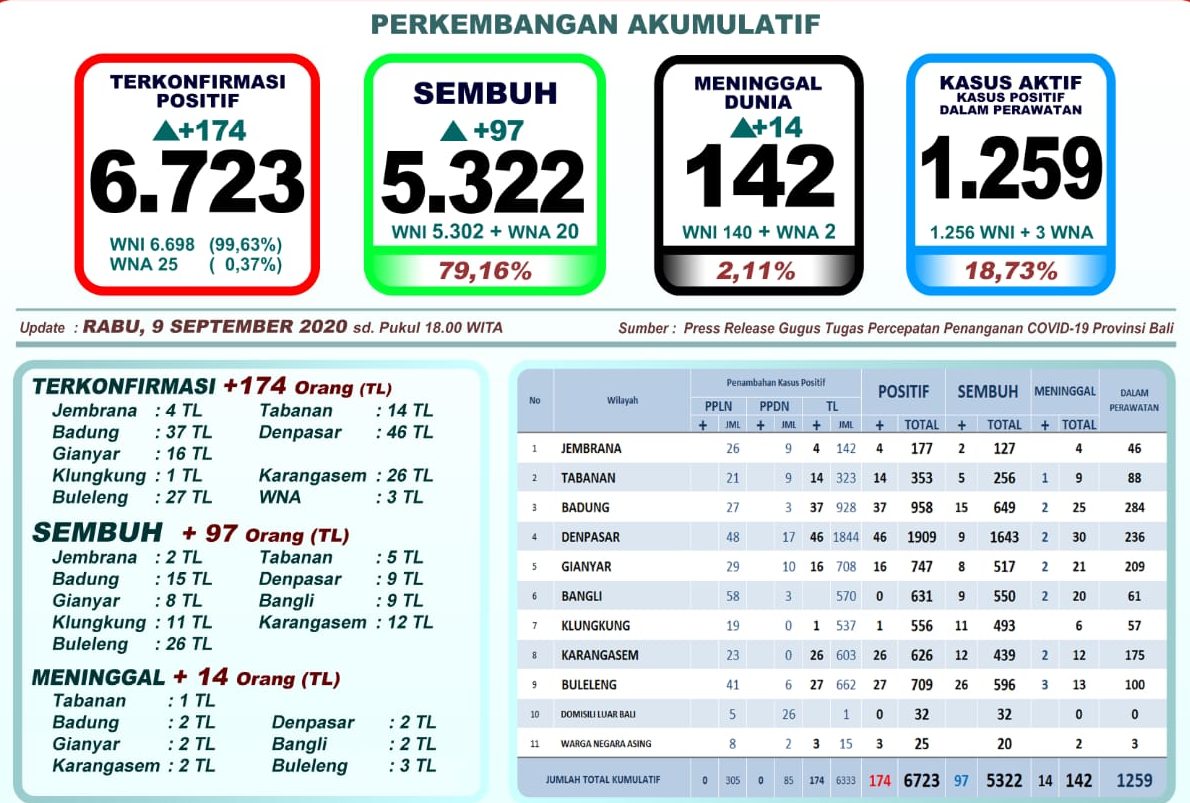 Di hari yang sama Rabu (9/9/2020), terkonfirmasi positif sebanyak 174 orang melalui transmisi lokal (TL) yang dilaporkan delapan kabupaten/kota di Bali kecuali Bangli. Jumlah ini menempatkan Bali tetap berada diperingkat kelima nasional tambahan harian kasus positif, di bawah the big four yakni DKI Jakarta sebanyak 1.004 orang, Jawa Timur 370 orang, Jawa Barat 288 orang dan Jawa Tengah 281 orang.