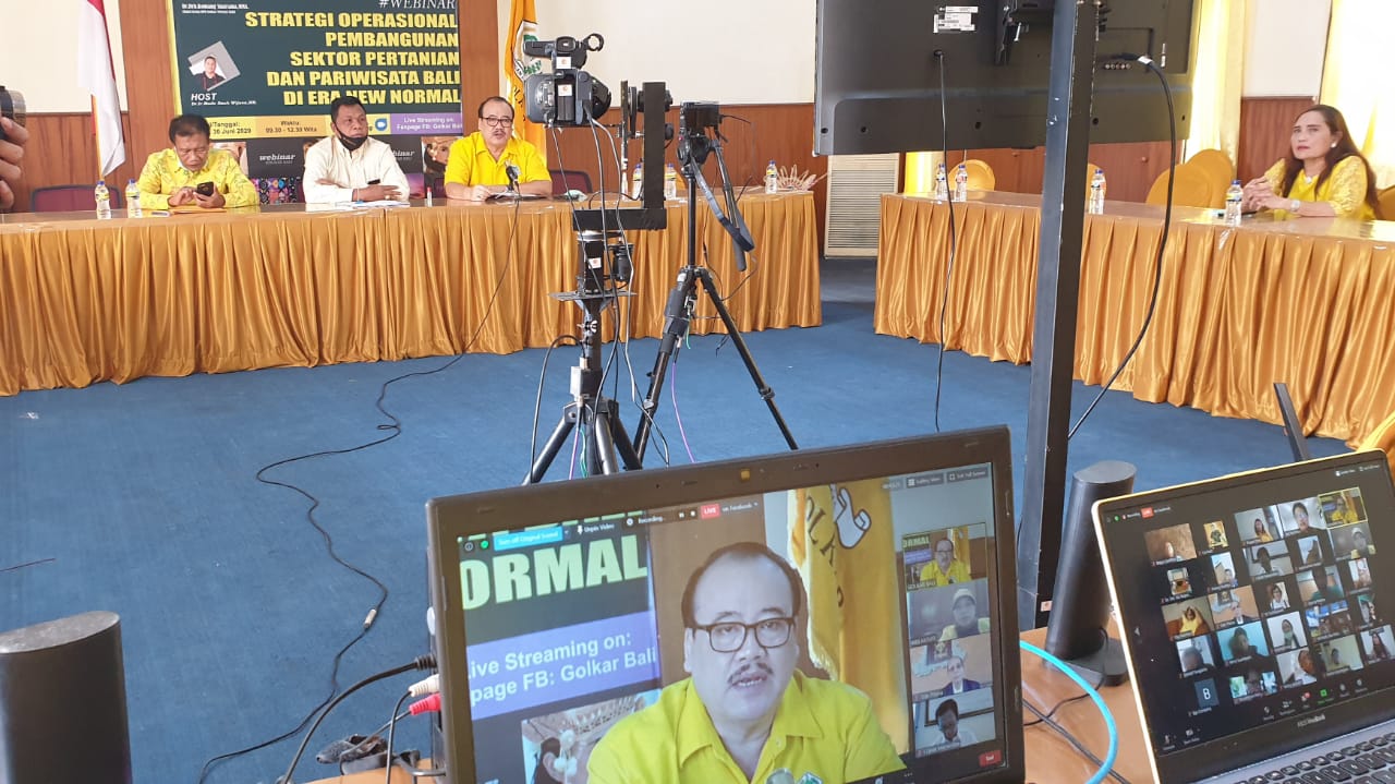 DENPASAR – Puluhan tahun berjalan, masih saja ada pihak membenturkan antara pariwisata dengan pertanian sebagai dua entitas berlawanan. Padahal kedua sektor ini terbukti bisa berjalan beriringan dan produknya juga saling bergantung satu sama lain. Hal itu menjadi salah satu fokus dalam webinar bertajuk “Strategi Operasional Pembangunan Sektor Pertanian dan Pariwisata Bali di Era New Normal” yang diadakan DPD Partai Golkar Bali, Selasa (30/6/2020).
