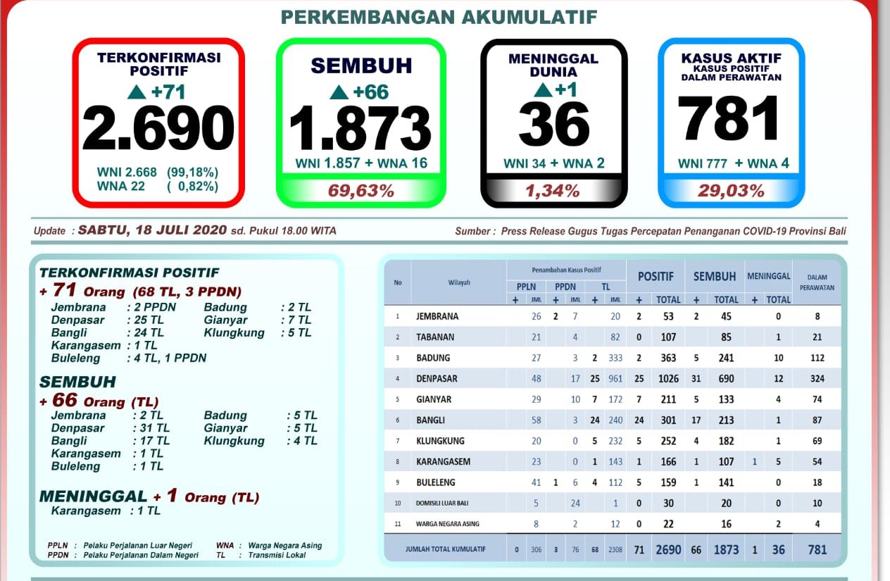 DENPASAR – Perkembangan harian kasus Covid-19 di Bali, Sabtu (18/7/2020) kembali menyampaikan kabar duka, satu pasien covid-19 akibat transmisi lokal meninggal dunia. Di hari yang sama, juga ada tambahan kasus positif baru sebanyak 71 orang. Sementara kabar baiknya, sebanyak 66 orang dinyatakan sembuh.