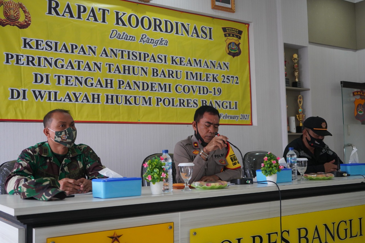 BANGLI – Mengimplementasikan Keputusan FKUB dan PHDI Provinsi Bali tentang pembatasan kegiatan keagamaan yang berpotensi menimbulkan kerumunan, Polres Bangli menggelar rapat koordinasi bersama instansi terkait menyongsong perayaan Tahun Baru Imlek 2020 pada 12 Februari nanti di Rupatama Polres Bangli, Senin (8/2/2021). Rapat dipimpin Wakapolres Kompol I Gede Wali dengan dihadiri perwakilan Kodim 1626/ Bangli, Kadis Satpol PP dan Damkar Bangli, I Dewa Agung Suryadarma; Dinas Kesehatan Bangli, Kasi Kedaruratan dan Logistik BPBD Bangli, I Ketut Agus Sutapa, serta tujuh ketua konco Bangli.