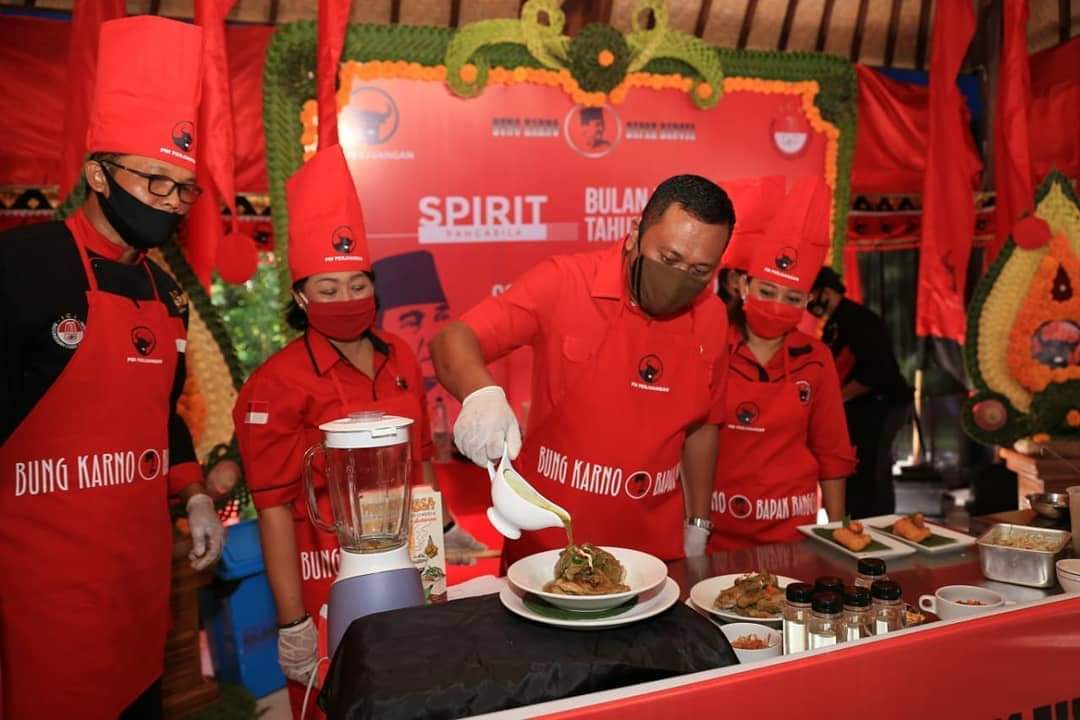 GIANYAR – DPC PDIP Gianyar bekerjasama dengan Indonesian Chef Association (ICA) Bali menggelar live cooking secara virtual dan live streaming, sosialisasi pengolahan bahan pangan substitusi beras/ bahan pokok berbasis potensi lokal alam Bali berdasarkan resep Mustika Rasa warisan Bung Karno. Kegiatan demo masak serangkaian peringatan Bulan Bung Karno 2020 digelar di Overseas Training Center (OTC) Gianyar, Jumat (26/6).