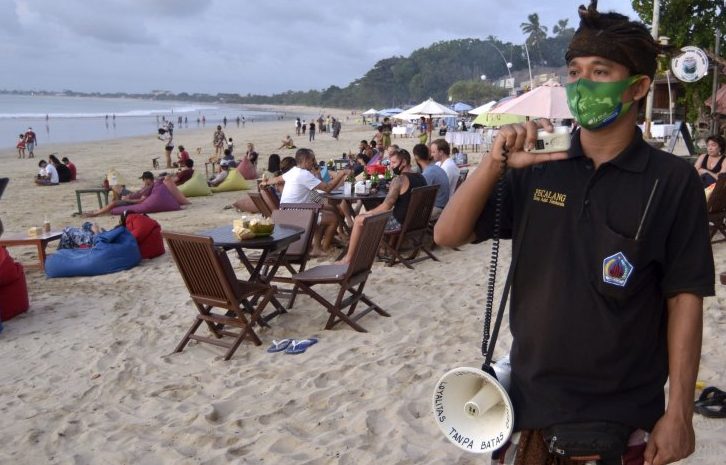 MANGUPURA – Pecalang atau petugas keamanan adat Bali di kawasan Desa Adat Jimbaran, Kabupaten Badung, bersama unsur TNI/Polri serta Linmas setempat terus melakukan pengawasan penerapan protokol kesehatan khususnya bagi pengunjung pantai pascapembukaan kembali objek wisata pantai di kawasan tersebut