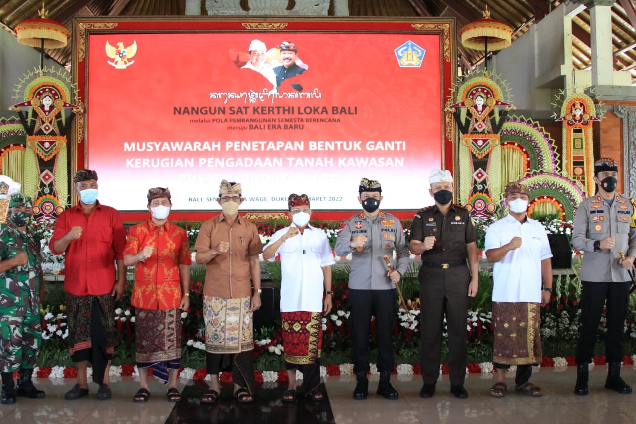 KLUNGKUNG – Bupati Klungkung, Nyoman Suwirta; bersama Ketua DPRD Klungkung, AA Gde Anom; mendampingi Gubernur Bali, Wayan Koster, melaksanakan musyawarah penetapan bentuk ganti kerugian pengadaan tanah kawasan Pusat Kebudayaan Bali di Balai Budaya Ida I Dewa Istri Kanya, Klungkung, Senin (14/3/2022).