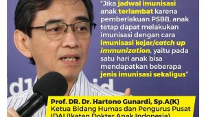 Hartono menambahkan jika jadwal imunisasi anak terlambat karena pemberlakuan PSBB, anak tetap dapat melakukan imunisasi dengan cara imunisasi kejar/catch up immunization, yaitu pada satu hari anak bisa mendapatkan beberapa jenis imunisasi sekaligus. Walaupun dalam situasi pandemi Covid-19, anak-anak tetap mendapatkan kebutuhan kesehatan untuk tumbuh berkembang dengan baik tanpa terserang penyakit berbahaya lainnya. yes