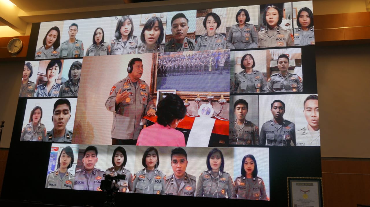 DENPASAR – Imbauan tidak berkerumun tidak menghalangi Polda Bali “mengumpulkan” personel untuk paduan suara (choir). Malah Polda mendapat sertifikat rekor dari Museum Rekor Indonesia (Muri) karena mengumpulkan 1.946 personel dalam satu polda menyanyi bareng, tapi secara virtual alias melalui dunia maya. Pemecahan rekor ini sekaligus sebagai kado HUT ke-74 Bhayangkara yang tiba, Rabu (1/7/2020).