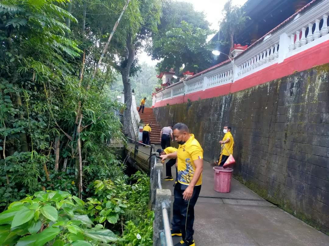 Baksos religi di Kecamatan Blahbatuh digelar di Vihara Amurva Bhumi. Personel gabungan Polres Gianyar dan Polsek Blahbatuh yang diterjunkan gotong royong bersih-bersih sampah, selokan air dan rumput-rumput liar.