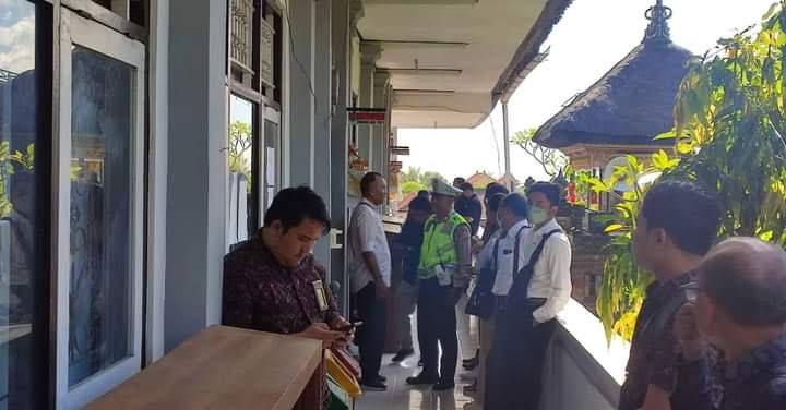GIANYAR – Polsek Blahbatuh mengawal kegiatan seleksi tertulis Panitia Pemungutan Suara (PPS) untuk Pemilu Serentak 2024 di Kabupaten Gianyar, Selasa (10/1/2023).