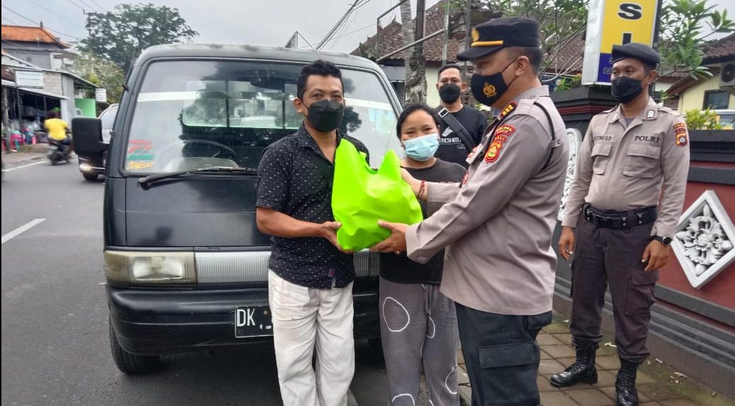 Kapolsek Payangan, AKP I Putu Agus Ady Wijaya, memberikan paket sembako kepada warga masyarakat, khususnya sopir angkutan yang melintas di wilayah Payangan.