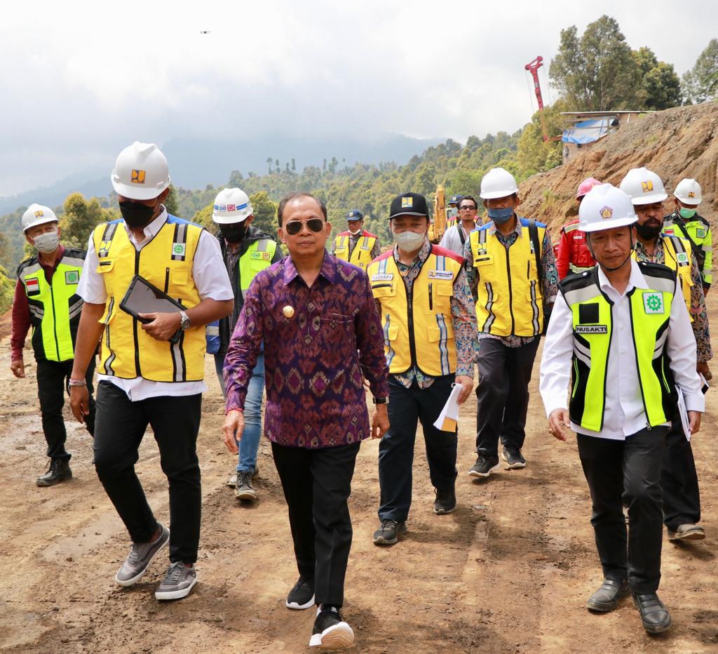 BULELENG – Gubernur Bali, Wayan Koster, meninjau progres pembangunan shortcut Singaraja-Mengwitani pada titik 8, di Desa Gitgit, Kecamatan Sukasada, Kabupaten Buleleng, Rabu (3/8/2022).