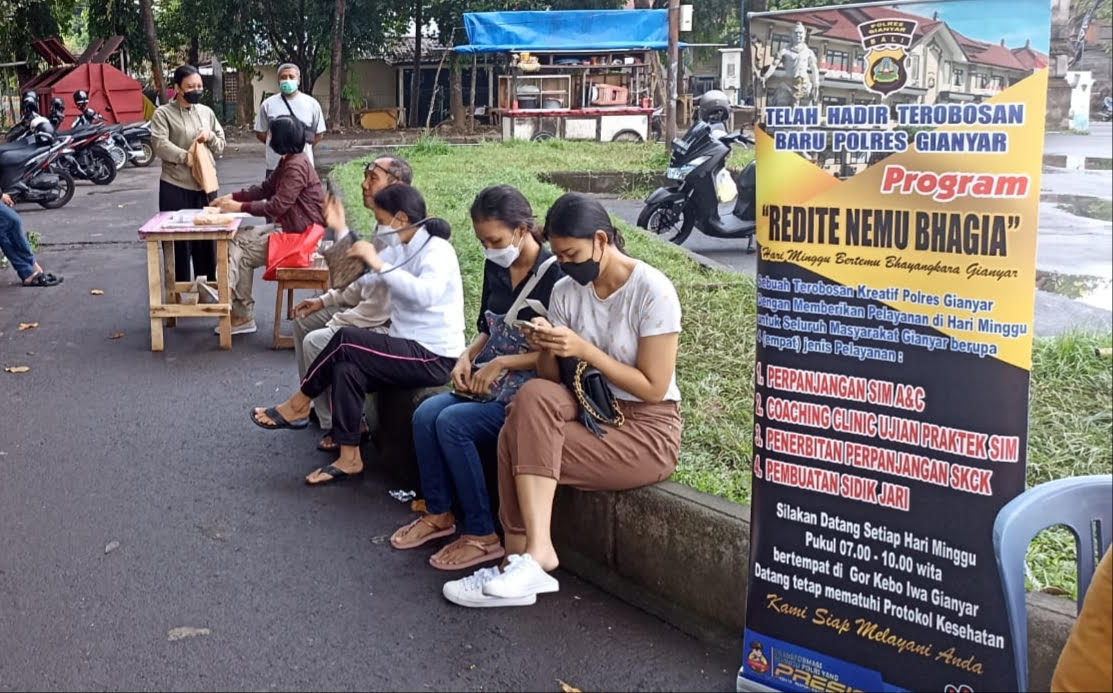 Kasat Intel Polres Gianyar, AKP Bagus Nagara Baranacita, mengatakan, Polres Gianyar khusus setiap Minggu memberi pelayanan pembuatan SKCK dan SIM kepada masyarakat melalui Redite Nemu Bhagia. “Ini kami menerima dua permohonan penerbitan SKCK,” katanya.
