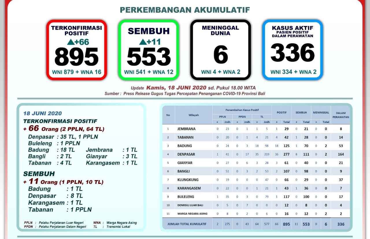 Dengan penambahan 66 kasus baru tersebut, secara kumulatif jumlah kasus positif Covid-19 di Provinsi Bali menjadi 895 orang (879 WNI dan 16 WNA). Kabar baiknya di hari yang sama, 11 pasien dinyatakan sembuh.
