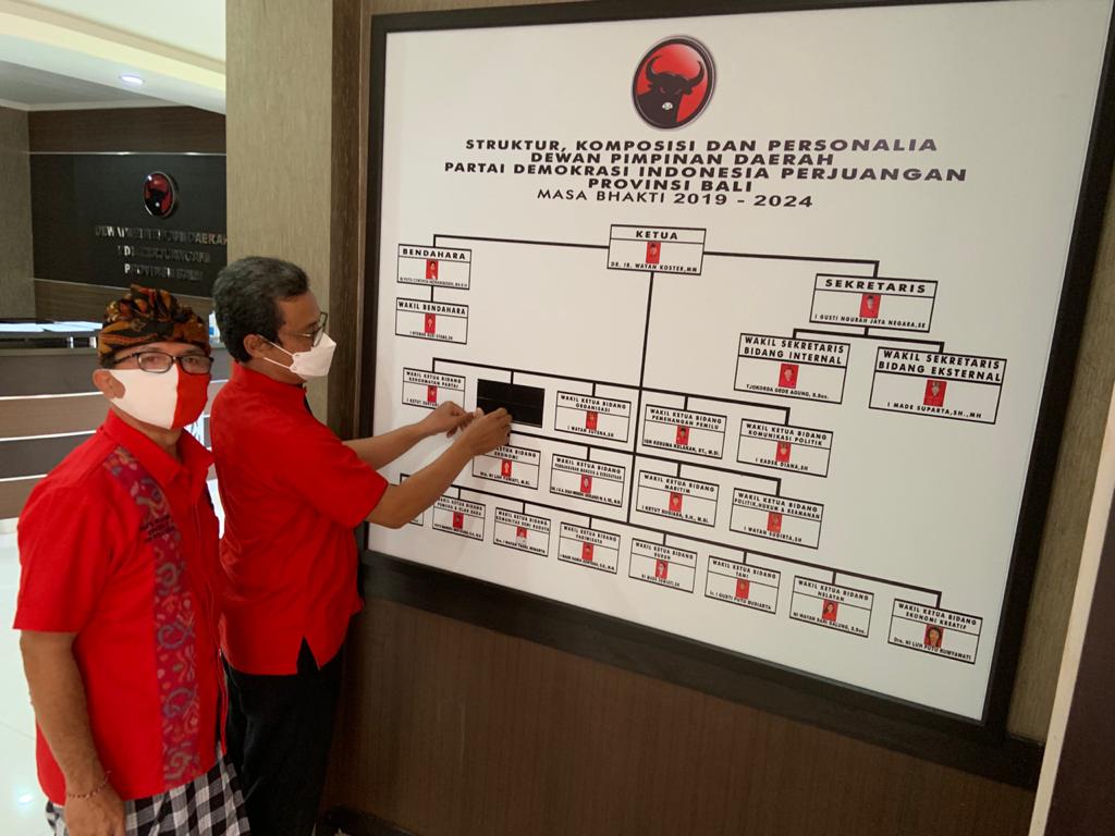 Usai rilis ke media, seorang staf melenggang ke papan struktur DPD PDIP Bali membawa lakban hitam untuk menutup kolom nama dan foto serta jabatan Gianyar. “Ya, ini sudah resmi dipecat, sekarang ditutup,” cetus Suparta kalem. hen