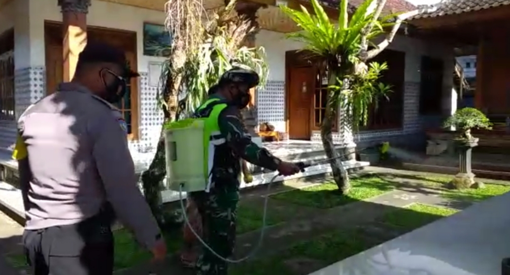 BANGLI – Satgas Gotong Royong Desa Adat Sidembunut menggelar disinfeksi ke rumah-rumah warga, Minggu (21/2/2021). Kegiatan yang dibantu personel Kodim 1626/Bangli itu sebagai upaya memutus rantai penyebaran virus Covid-19, sekaligus implementasi Pemberlakuan Pembatasan Kegiatan Masyarakat (PPKM) berbasis desa/kelurahan. Sebelum penyemprotan disinfektan dilakukan, personel Kodim menyampaikan imbauan kepada masyarakat untuk tetap disiplin melaksanakan protokol kesehatan.